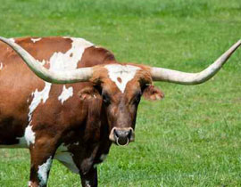 ثور يرفع رجلا في الهواء بين قرنيه.