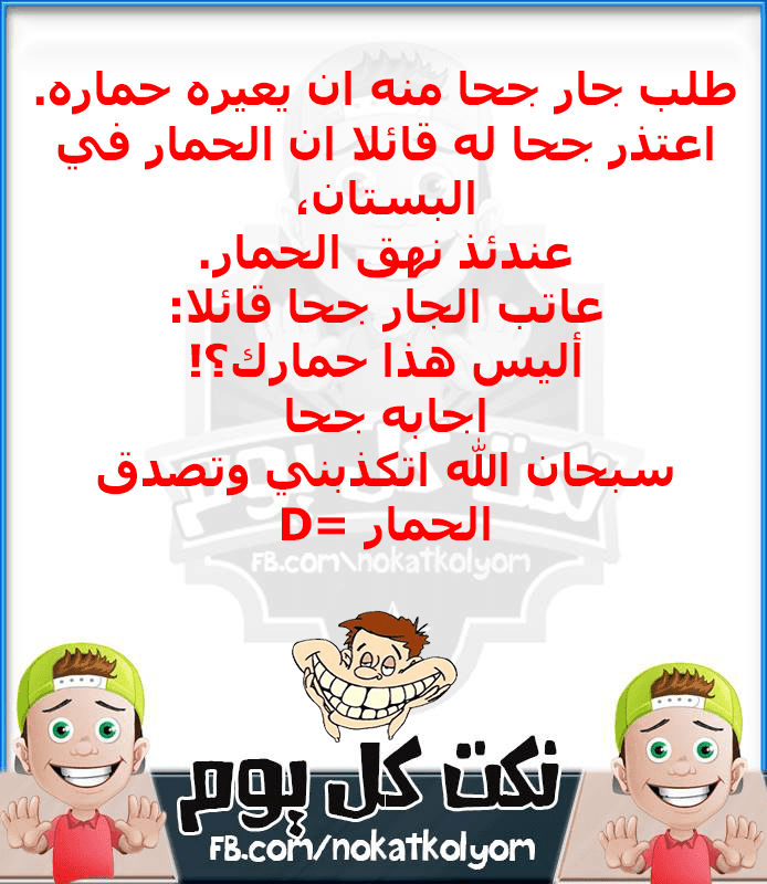 Https bit ly 2rqzygw كونوا أول من يصله إشعار ليشاهد أحدث فيديو. ع رف جحا على أن ه شخصية هزلية انتشرت في الأدب الشعبي فكانت تثير الطرفة في المجالس وترسم الابتسامة على م حي ا الجالس وجحا رجل عايش أحداث عصره بذكاء ساخر فر ويت حوله بعض الحكايات والطرائف التي لها أول وليس. جحا هو شخصي ة طريفة أضحكت الملايين من الن اس على مر الزمان بالنوادر الطريفة والأخبار التي كانت تصدر عنه مع أن شخصي ة جحا تعتبر اليوم مجرد شخصي ة خرافي ة في مخيلة الن اس إل ا أن كتب الأدب والتراجم والمعاجم. صور عن جحا وحمارة نكت عن جحا وحمارة حمل جحا أوزة مشوية إلى الأمير وغلبه الجوع ورائحة الشواء في الطريق فأكل إحدى رجليها ثم وضعها بين يدي الأمير فسأله عن الرجل الناقصه أين ذهبت.